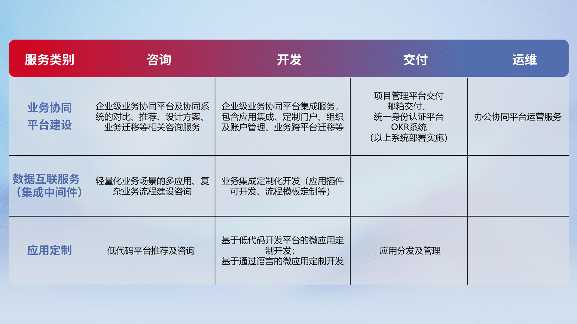 针对钉钉、、、企微、、、、IDaas等平台级产品提供产品的规划、、方案、、交付、、定制化开发等服务,,,实现如统一协同办公、、、智能客户服务、、混合会议管理、、智能数据查询、、、、等业务场景,,,,实现数字化转型。。
